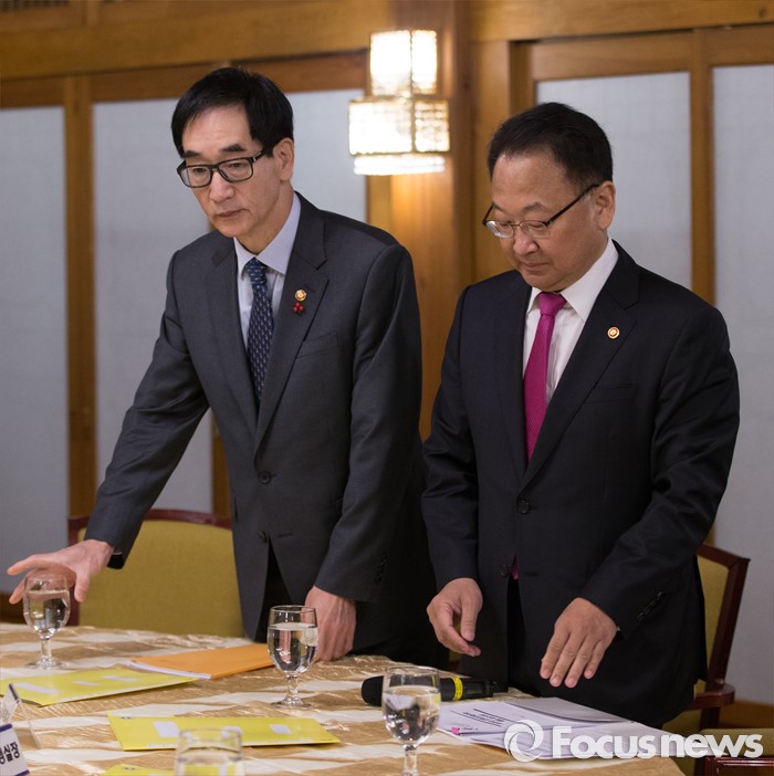 (서울=포커스뉴스) 19일 오전 서울 종로구 삼청동 국무총리공관에서 열린당·정·청 정책조정협의회에 참석한 유일호(오른쪽) 경제부총리 겸 기획재정부 장관과 이준식 사회부총리 겸 교육부 장관이 착석하고 있다.