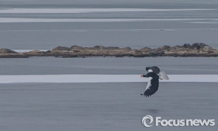 (남양주=포커스뉴스) 올겨울 들어 가장 추운 19일 오전 참수리(천연기념물243호) 성조가 꽁꽁 얼어붙은 팔당대교 밑 한강을 순회하며 먹잇감을 찾고 있다. 참수리는 러시아 캄차카반도에서 번식하며, 겨울철 50여 마리 내외가 한국을 찾는 아주 보기 드문 국제보호조로 한강 생태계의 최강자다. 사냥을 하는 맹금류중 가장 큰 참수리는 크기가 암컷은 102Cm 정도에 양날개를 합친 길이가 244cm 나 된다. 주로 누치, 붕어 등 물고기를 잡아 먹지만, 비오리나,논병아리등 잠수성 오리들도 사냥한다.