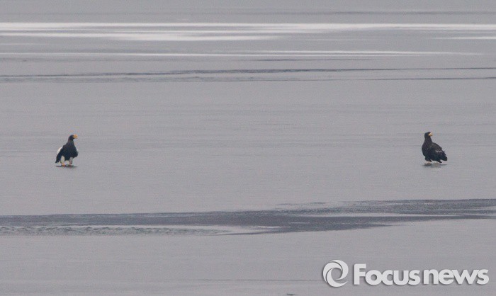 (남양주=포커스뉴스) 서울 지방 아침 기온이 영하 14.5도로 올겨울 들어 가장 추운 19일 오전 참수리(천연기념물243호) 성조(왼쪽)와 유조가 꽁꽁 얼어붙은 팔당대교 밑 한강의 얼음판 위에 앉아 고향의 분위기를 즐기고 있다. 참수리는 러시아 캄차카반도에서 번식하며, 겨울철 50여 마리 내외가 한국을 찾는 아주 보기 드문 국제보호조로 한강 생태계의 최강자다. 사냥을 하는 맹금류중 가장 큰 참수리는 크기가 암컷은 102Cm 정도에 양날개를 합친 길이가 244cm 나 된다. 주로 누치, 붕어 등 물고기를 잡아 먹지만, 비오리나,논병아리등 잠수성 오리들도 사냥한다.