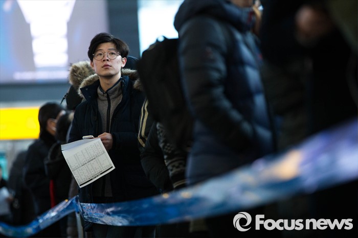 (서울=포커스뉴스) 설 승차권 현장예매가 시작된 19일 오전 서울 중구 서울역 매표소 앞에서 시민들이 승차권을 구입하기 위해 줄을 서있다. 코레일은 19일과 20일, 이틀 동안 설 연휴 열차 승차권 예매를 시작한다고 밝혔다.