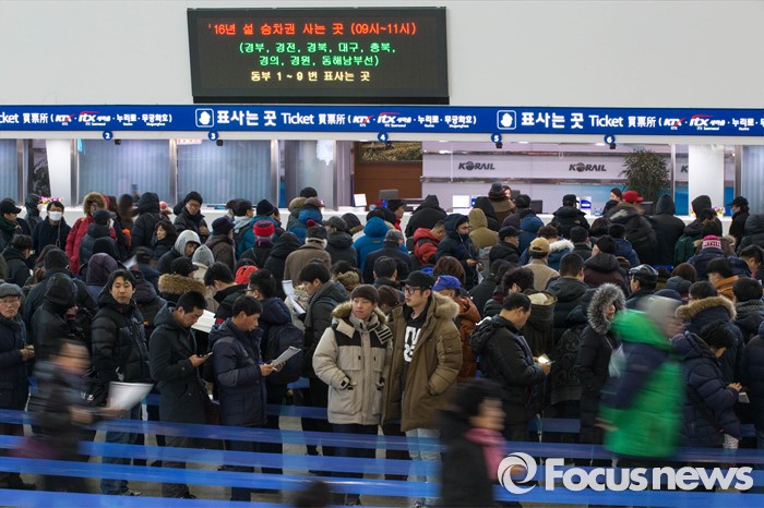 (서울=포커스뉴스) 19일 오전 서울 중구 서울역 매표소 앞에서 시민들이 설 승차권을 구입하기 위해 줄을 서있다.