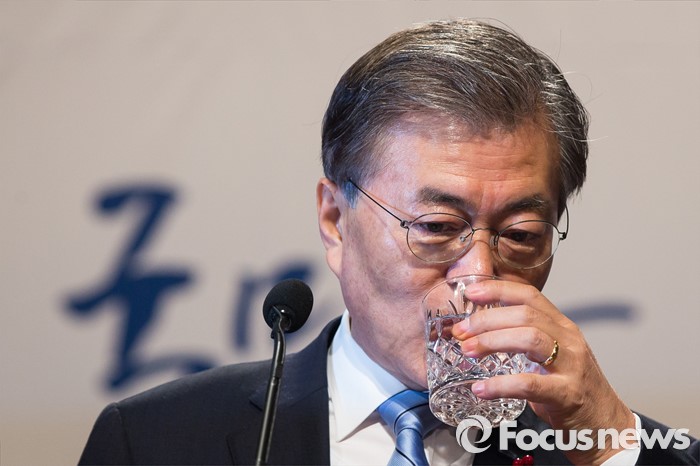 (서울=포커스뉴스) 문재인 더불어민주당 대표가 19일 오전 서울 여의도 국회 의원회관에서 신년 기자회견을 마친 뒤 물을 마시고 있다.