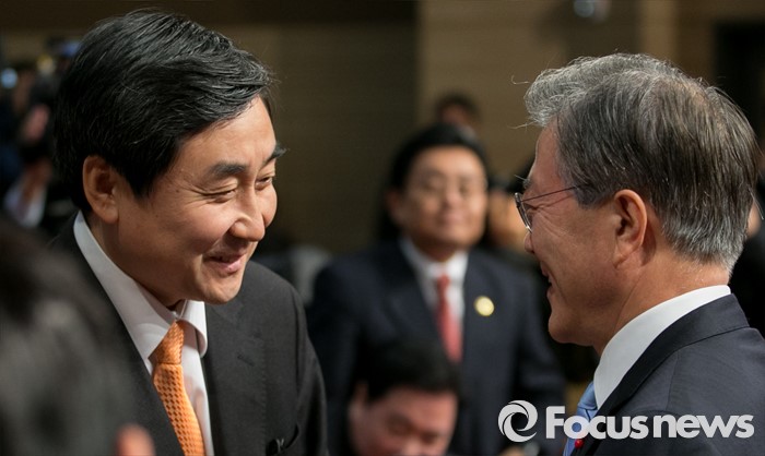 (서울=포커스뉴스) 문재인(오른쪽) 더불어민주당 대표가 19일 오전 서울 여의도 국회 의원회관에서 신년 기자회견을 마친 뒤 이종걸 원내대표와 인사하고 있다.