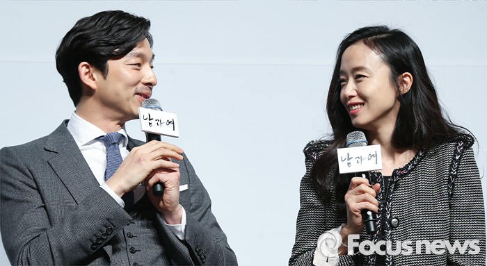 (서울=포커스뉴스) 19일 오전 서울 강남구 압구정 CGV에서 열린 영화 '남과 여' 제작보고회에 참석한 배우 공유(왼쪽)와 전도연이 촬영 소감을 밝히고 있다.