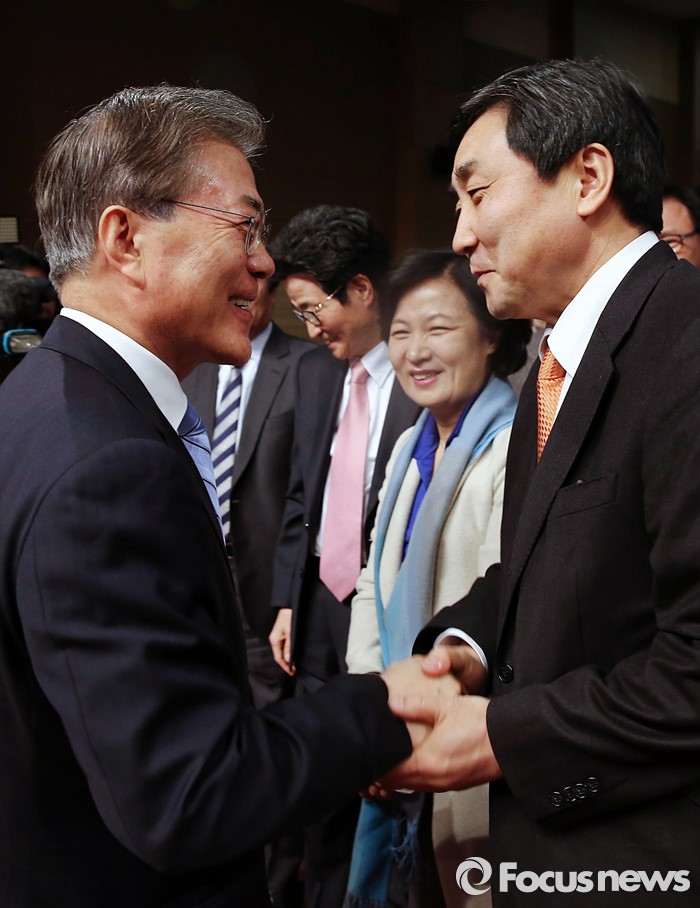 (서울=포커스뉴스) 문재인(왼쪽) 더불어민주당 대표가 19일 오전 서울 여의도 국회 의원회관에서 신년 기자회견을 마친 뒤 이종걸 원내대표와 악수하고 있다.