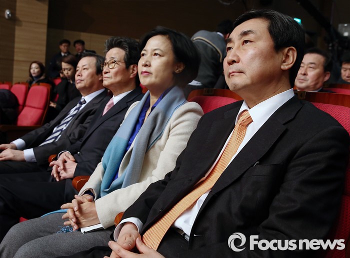 (서울=포커스뉴스) 이종걸(오른쪽부터) 더불어민주당 원내대표, 추미애 최고위원, 이목희 정책위의장, 도종환 대변인이 19일 오전 서울 여의도 국회 의원회관에서 문재인 대표의 신년 기자회견을 지켜보고 있다.