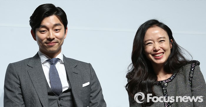 (서울=포커스뉴스) 19일 오전 서울 강남구 압구정 CGV에서 열린 영화 '남과 여' 제작보고회에 참석한 배우 공유(왼쪽)와 전도연이 미소를 짓고 있다.
