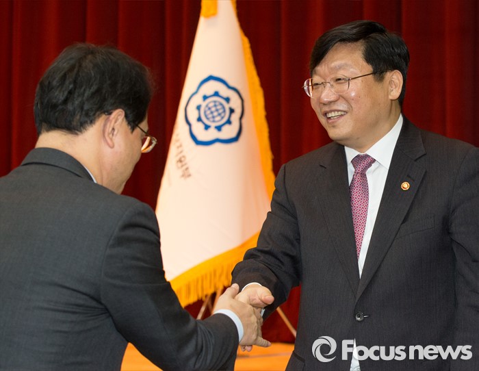 이에 대해 주 장관은 “산업부와 중기청의 중소기업 수출지원 정책을 통합·연계해 효과적으로 지원하겠다”며 “올해 7월로 끝나는 토요일 산업용 전기요금 할인 적용기간 연장을 적극 검토하겠다”고 말했다. 이어 “‘FTA취약분야 전용자금’을 활용해 쥬얼리 업계를 지원하겠다”고 덧붙였다.(세종=포커스뉴스) 주형환 신임 산업통상자원부장관이 13일 오후 세종시 정부세종청사 산업부 대강당에서 열린 취임식에 참석해 직원들과 인사를 하고 있다. 2016.01.13 김기태 기자