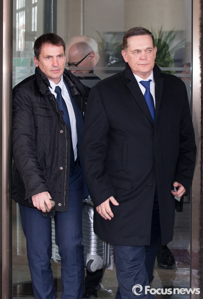 (세종=포커스뉴스) 요하네스 타머(오른쪽) 아우디폭스바겐코리아 사장과 프리드리히 요한 아이히러 독일 폭스바겐 파워트레인 총괄책임자 등 독일본사 직원들이 19일 오전 세종시 정부세종청사 환경부 교통환경과에서 결함시정 관련 기술적 내용을 설명하고 환경부를 나서고 있다.
