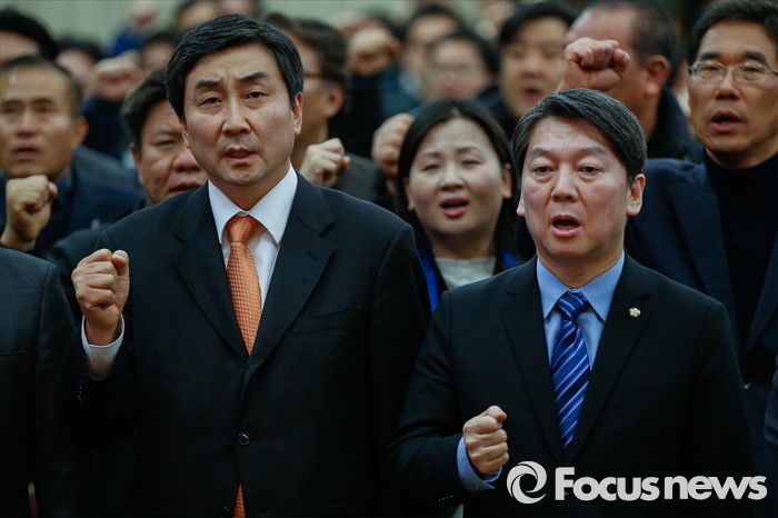 (서울=포커스뉴스) 국민의당(가칭) 안철수 의원과 더불어민주당 이종걸 원내대표가 19일 오후 서울 중구 은행회관 국제회의실에서 열리는 금융노조 제51차 정기전국대의원대회에 참석해 민중가요를 부르고 있다.