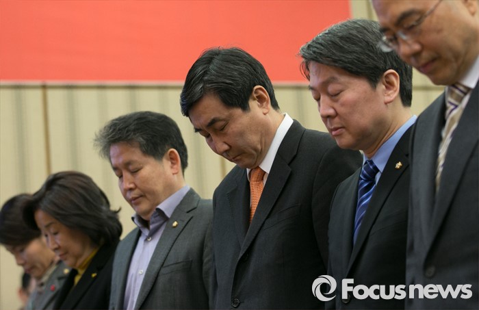 (서울=포커스뉴스) 국민의당(가칭) 안철수 의원(오른쪽 두번째)과 더불어민주당 이종걸 원내대표가 19일 오후 서울 중구 은행회관 국제회의실에서 열리는 금융노조 제51차 정기전국대의원대회에 참석해 묵념을 하고 있다.