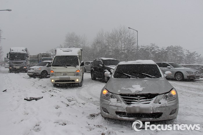 | △ 호남고속도로 연쇄추돌...눈길에 미끄러진 차량들 |