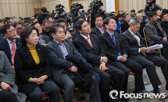 (서울=포커스뉴스)국민의당 안철수 의원과 더불어민주당 이종걸 원내대표, 정의당 심상정 대표가 참석한 가운데 19일 오후 서울 중구 은행회관 국제회의실에서 금융노조 제51차 정기전국대의원대회가 열리고 있다. (왼쪽 첫번째부터) 정의당 심상정 대표, 더불어민주당 김경협 의원, 더불어민주당 이종걸 원내대표, 국민의당 안철수 의원.