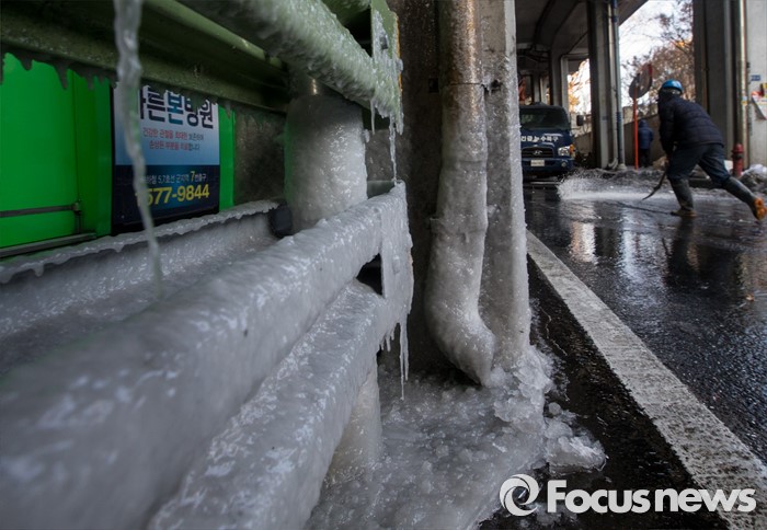 (서울=포커스뉴스) 19일 오후 서울 광진구 동부지방법원 앞 상수관이 노후로 파열돼 인근 도로가 결빙돼 있다.