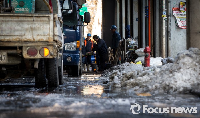 (서울=포커스뉴스) 19일 오후 서울 광진구 동부지방법원 앞 상수관이 노후로 파열돼 인근 도로가 결빙돼 있다.