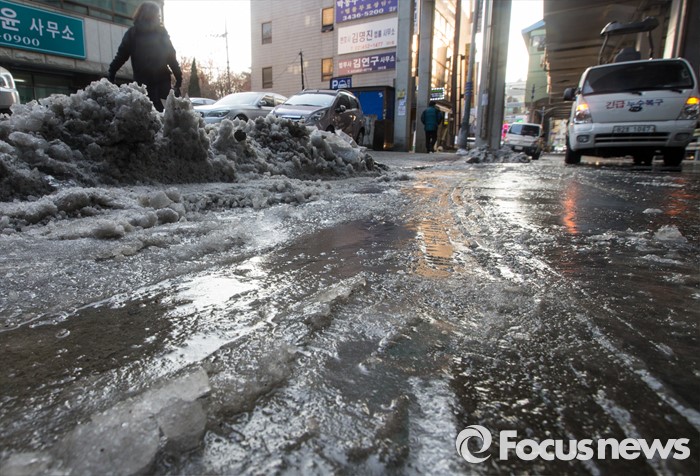 (서울=포커스뉴스) 19일 오후 서울 광진구 동부지방법원 앞 상수관이 노후로 파열돼 인근 도로가 결빙돼 있다.