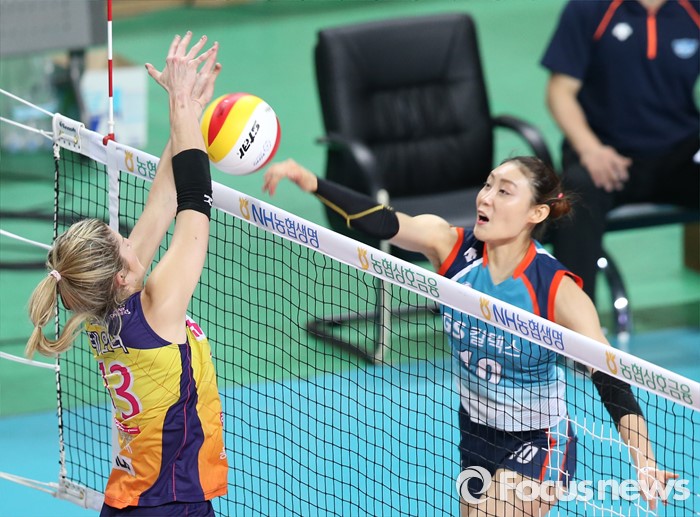 (서울=포커스뉴스) 19일 장충체육관에서 열린 '2015-2016NH농협 V-리그' 여자부 GS칼텍스-흥국생명 경기에서 GS칼텍스 배유나의 연타 공격에 흥국생명 테일러가 블로킹으로 막고 있다.