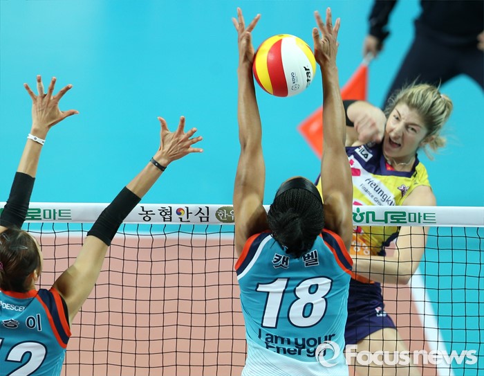 (서울=포커스뉴스) 19일 장충체육관에서 열린 '2015-2016NH농협 V-리그' 여자부 GS칼텍스-흥국생명 경기에서 흥국생명 테일러의 강스파이크가 GS칼텍스 캣벨의 블로킹을 뚫고 있다.