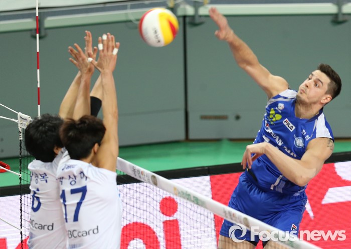 (서울=포커스뉴스) 19일 장충체육관에서 열린 '2015-2016NH농협 V-리그' 남자부 우리카드-대한항공 경기에서 대한항공 모로즈가 우리카드 나경복, 박상하의 이중블로킹을 향해 스파이크를 하고 있다.