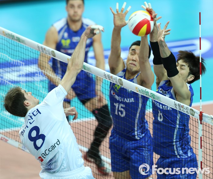 (서울=포커스뉴스) 19일 장충체육관에서 열린 '2015-2016NH농협 V-리그' 남자부 우리카드-대한항공 경기에서 대한항공 김형우(15)와 김학민이 우리카드 알렉산더의 스파이크를 블로킹으로 차단하고 있다.