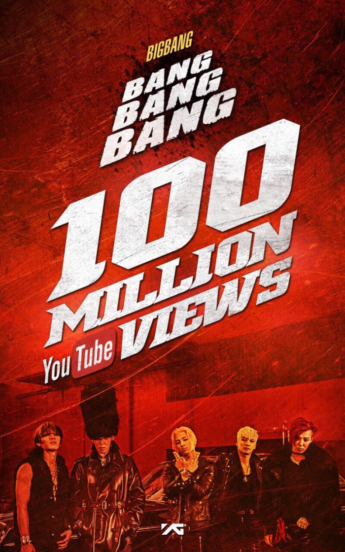 '뱅뱅뱅' 뮤직비디오는 유튜브가 지난해 12월7일 발표한 '올해 전세계 사용자들이 가장 많이 본 K팝 뮤직비디오' 1위에 오르기도 했다. 순위표 10위 안에 '루저' '베베' '우리사랑하지말아요' '맨정신' 등이 포함돼 빅뱅의 저력을 입증했다. 빅뱅은 지난해 5월부터 8월까지 선보인 'MADE SERIES'로 국내외 음원차트, 지상파 가요프로그램 정상을 석권했다.YG엔터테인먼트가 소속그룹 빅뱅의 '뱅뱅뱅' 뮤직비디오 1억뷰 돌파 기념 포스터를 공개했다. <사진제공=YG엔터테인먼트>