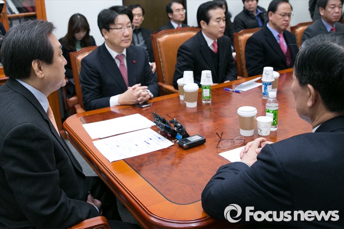 (서울=포커스뉴스) 김무성(왼쪽) 새누리당 대표가 20일 오전 서울 여의도 국회에서 열린 새누리당 제1차 총선기획단 회의에 참석해 모두발언하고 있다.