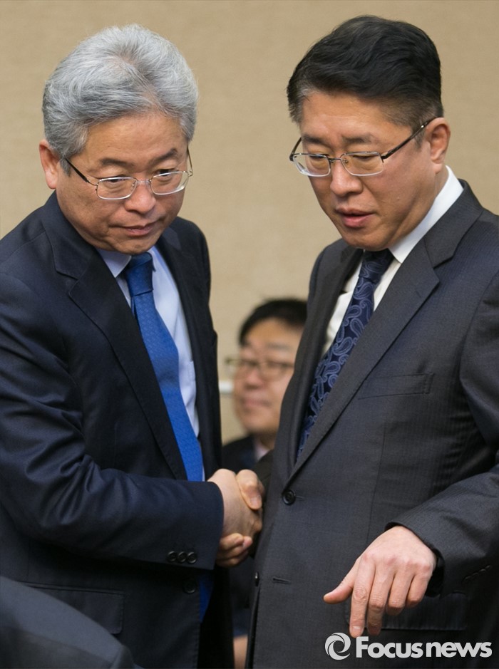 (서울=포커스뉴스) 20일 오전 서울 여의도 국회 귀빈식당에서 열린 테러 위기상황 대처를 위한 합동 당정협의에 참석한 이철우(왼쪽) 새누리당 정보정조위원장과 김수민 국가정보원 2차장이 대화하고 있다.