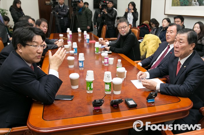 (서울=포커스뉴스) 새누리당 총선기획단장인 황진하(오른쪽) 사무총장과 권성동(왼쪽) 전략기획본부장을 비롯한 위원들이 20일 오전 서울 여의도 국회에서 열린 새누리당 제1차 총선기획단 회의에 참석해 대화하고 있다.