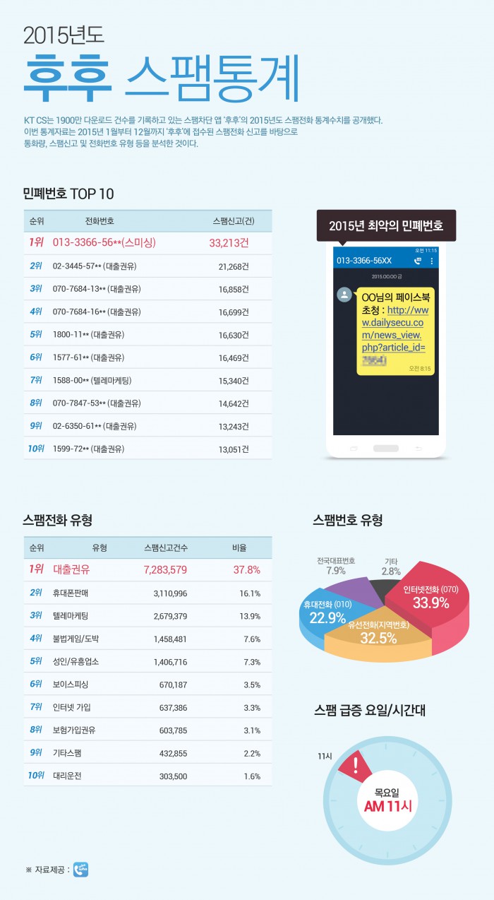 20일 KT CS(대표 유태열)가 스팸차단앱 '후후'의 2015년 스팸신고를 조사한 통계에 따르면 지난해 최악의 민폐번호는페이스북 초청을 가장한 스미싱 문자인 '013-3366-56**'으로 지난 해 3만3213건의 신고가 접수돼 2년 연속 1위를 차지했다. 이어 대출권유 전화인 '02-3445-57**', '070-7684-13**', '070-7684-16**' 등이 뒤를 이었다.