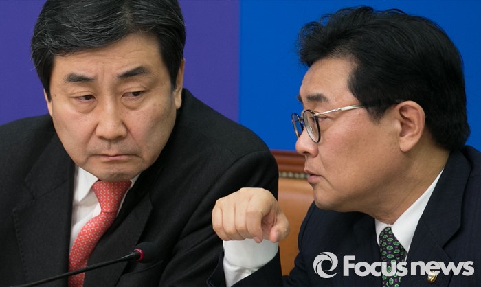 (서울=포커스뉴스) 이종걸(왼쪽) 더불어민주당 원내대표가 20일 오전 서울 여의도 국회에서 열린 최고위원회의에 참석해 전병헌 최고위원과 대화하고 있다.