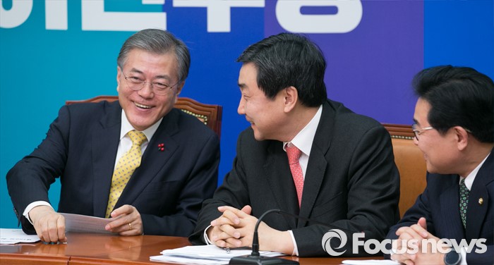 (서울=포커스뉴스) 문재인(왼쪽부터) 더불어민주당 대표와 이종걸 원내대표, 전병헌 최고위원이 20일 오전 서울 여의도 국회에서 열린 최고위원회의에 참석해 대화하고 있다.