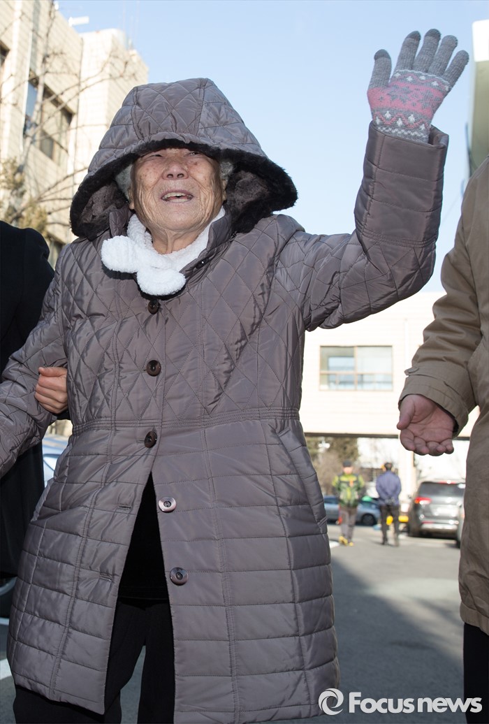 (서울=포커스뉴스) 책 '제국의 위안부'를 써 일본군 위안부 피해자들의 명예를 훼손했다는 혐의로 재판을 받게 된 박유하 세종대 국제학부 교수에 대한 공판이 열린 20일 오전 서울 광진구 동부지방법원 법정으로 위안부 피해자 할머니가 들어서고 있다.