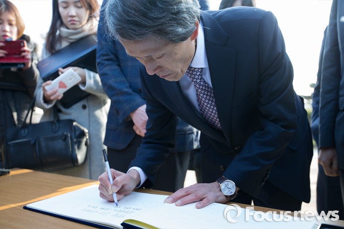 (서울=포커스뉴스) 한상진 국민의당 창당준비위원장이 20일 오전 서울 용산구 백범 김구 선생 묘역을 참배한 뒤 방명록을 작성하고 있다.