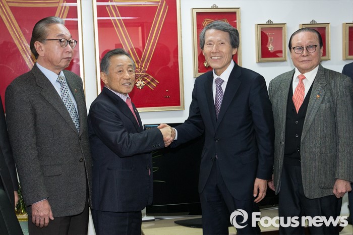 (서울=포커스뉴스) 한상진(오른쪽 두번째) 국민의당 창당준비위원장이 20일 오전 서울 여의도 광복회를 방문해 박유철(왼쪽 두번째) 광복회장과 악수를 하고 있다.