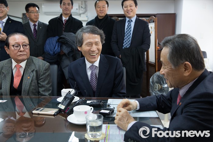 (서울=포커스뉴스) 한상진(가운데) 국민의당 창당준비위원장이 20일 오전 서울 여의도 광복회를 방문해 박유철(오른쪽) 광복회장과 대화하며 웃고 있다.