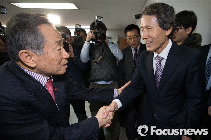 (서울=포커스뉴스) 한상진(오른쪽) 국민의당 창당준비위원장이 20일 오전 서울 여의도 광복회를 방문해 박유철 광복회장과 인사를 하고 있다.