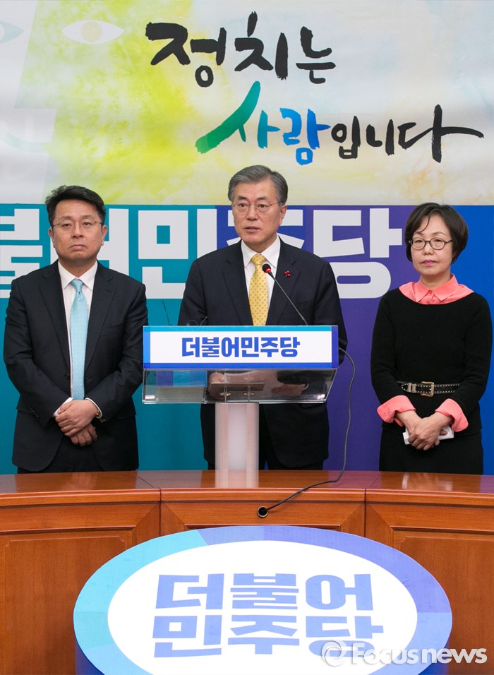 (서울=포커스뉴스) 문재인(가운데) 대표가 20일 오전 서울 여의도 국회 더불어민주당 대표실에서 열린 이철희(왼쪽), 권미혁(오른쪽) 입당 기자회견에 참석해, 인사말을 하고 있다.
