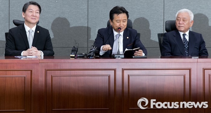 (서울=포커스뉴스) 20일 오전 서울 여의도 국회 의원회관에서 열린 국민의당 소속 의원단 회의에 참석한 김영환 의원이 의사봉 대신 주먹으로 개의 선언을 하고 있다. 왼쪽부터 안철수, 김영환, 김한길 의원.