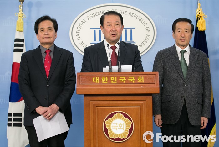 (서울=포커스뉴스) 박주선(가운데) 통합신당 창당준비위원장이 20일 오후 서울 여의도 국회 정론관에서 유선호(오른쪽), 장세환 전 의원 영입 기자회견을 하고 있다.