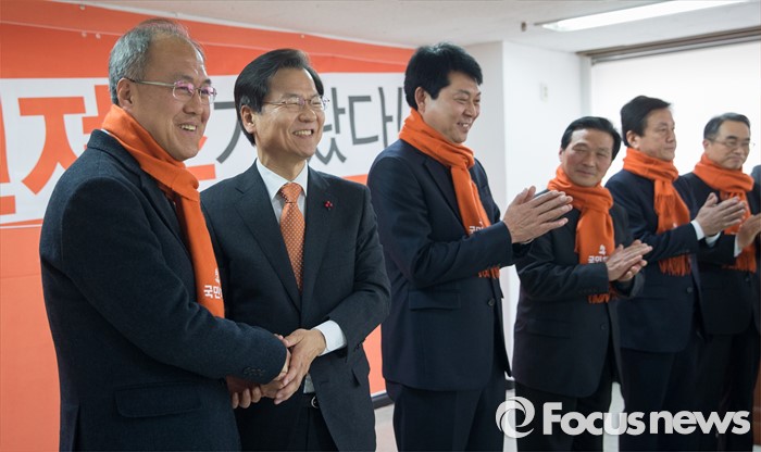 (서울=포커스뉴스) 국민회의 천정배 창당준비위원장이 20일 오후 서울 여의도 국민회의 당사에서 열린 인재 입당식에서 통일/노동 분야 5명의 인사들에게 목도리를 선물한 후 인사를 나누고 있다.