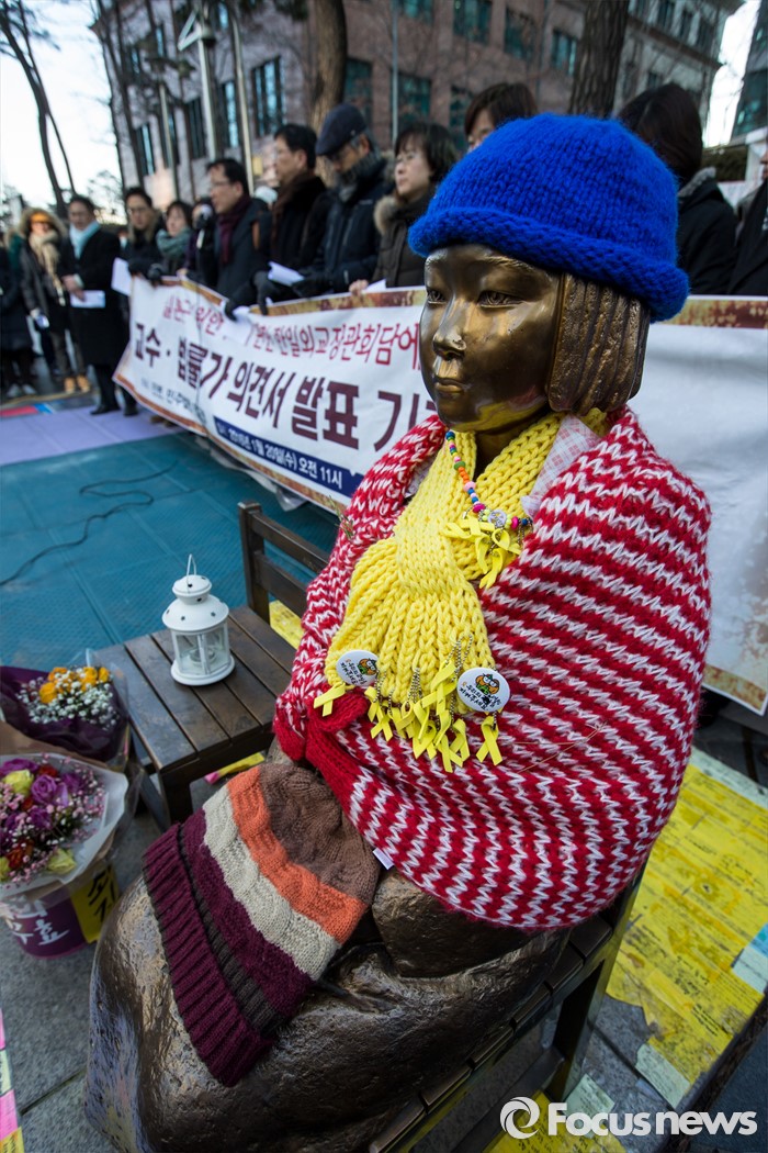 (서울=포커스뉴스) 20일 오전 서울 종로구 일본대사관 인근에서 민주사회를 위한 변호사모임 관계자들이 일본군 위안부 문제 관련 한일외교장관회담에 대한 교수, 법률가 의견서 발표 기자회견을 하고 있다.