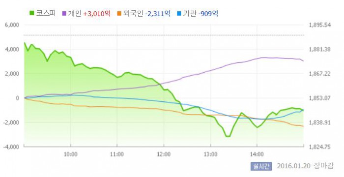 20일 코스피지수는 전일 대비 2.34%(44.19포인트) 하락한 1845.45에 장을 마쳤다. 코스피가 1850선 아래로 하락한 것은 지난해 8월 26일 이후 5개월 만이다.