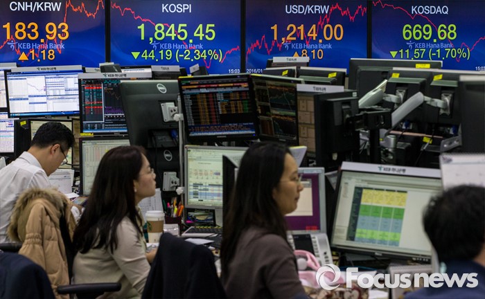 (서울=포커스뉴스) 코스피 지수가 외국인과 기관의 매도 공세에 전 거래일보다 44.19포인트(2.34%) 하락한 1,845.45에 거래를 마친 20일 오후 서울 중구 KEB하나은행 딜링룸에서 딜러들이 업무를 보고 있다. 이날 원달러 환율은 전 거래일보다 8.1원 오른 1214원에 거래를 마감했다.