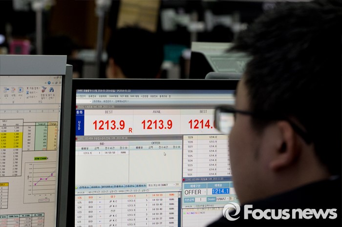 (서울=포커스뉴스) 코스피 지수가 외국인과 기관의 매도 공세에 전 거래일보다 44.19포인트(2.34%) 하락한 1,845.45에 거래를 마친 20일 오후 서울 중구 KEB하나은행 딜링룸에서 딜러들이 업무를 보고 있다. 이날 원달러 환율은 전 거래일보다 8.1원 오른 1214원에 거래를 마감했다.