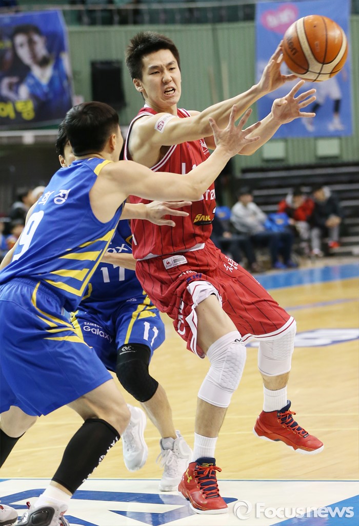 (서울=포커스뉴스) 20일 서울 잠실실내체육관에서 열린 2015-2016 프로농구 삼성-LG 경기에서 LG 유병현이 골밑 돌파를 시도하다 삼성 주희정의 수비에 막히자 패스하고 있다.