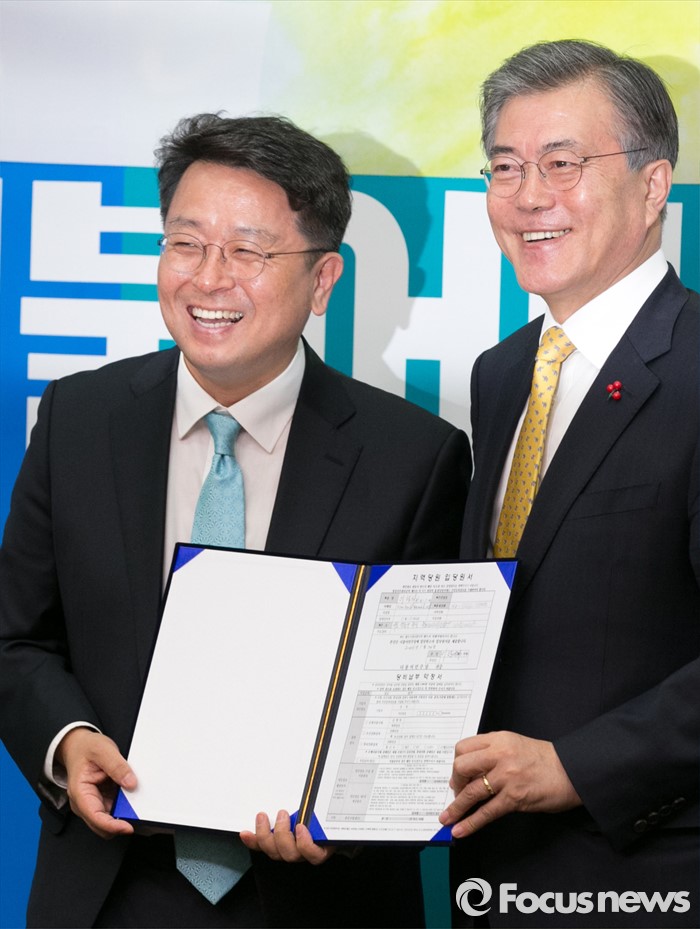 그는 "이 당을 젊고 새로운 정당으로 어떻게 바꿀지 고민을 같이하고 프로그램을 만들어 일종의 혁신운동을 하자는 것"이라며 "권한을 갖고 하는 것이 아니므로 대중적 에너지가 모이면 큰 흐름이 잡힐 것이라고 본다"고 강조했다.문재인 대표와 이철희 두문정치연구소 소장이20일 오전 서울 여의도 국회 더불어민주당 대표실에서 열린 입당 기자회견에 참석해 기념사진을 찍고 있다. 2016.01.20 박철중 기자