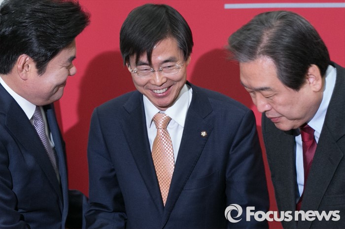 (서울=포커스뉴스) 더불어민주당을 탈당한 조경태(가운데) 의원이 21일 오전 서울 여의도 국회에서 열린 새누리당 최고위원회의에 참석해 김무성(오른쪽) 대표, 원유철 원내대표와 인사하고 있다.