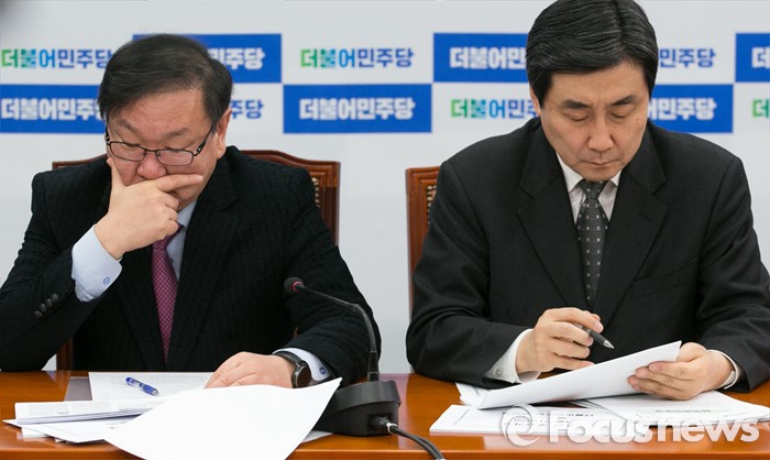 (서울=포커스뉴스) 이종걸(오른쪽) 더불어민주당 원내대표와 김태년 누리과정대책특위원장이 21일 오전 서울 여의도 국회에서 열린 정책조정회의에 참석해 회의 자료를 보고 있다.