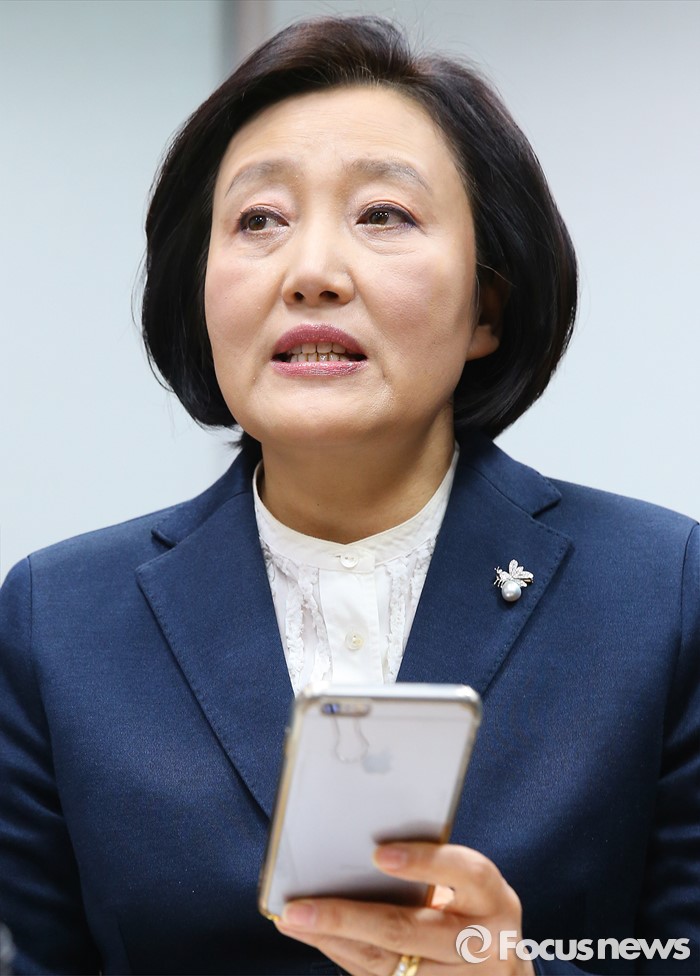 (서울=포커스뉴스) 당 잔류를 공식 선언한 박영선 더불어민주당 의원이 21일 오전 서울 여의도 국회 의원회관 의원실에서 기자간담회 도중 김종인 선대위원장과 주고받은 문자메세지를 읽고 있다.
