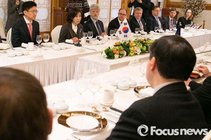 (서울=포커스뉴스) 나경원(뒷줄 왼쪽 두번째) 외교통일위원회 위원장이 21일 오후 서울 여의도 국회 사랑재에서 북한의 제4차 핵실험 후속 대책 논의를 위한 주한유럽연합(EU) 회원국 대사 초청 오찬간담회에 참석해 모두발언하고 있다.